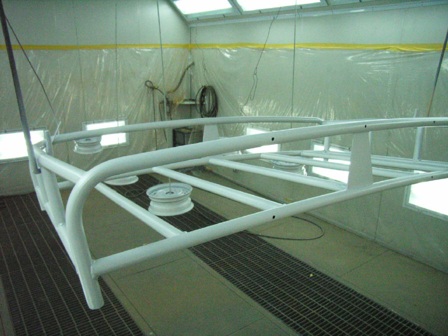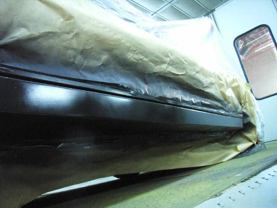 そして本塗り完了です。 いつも掲載している「本塗り完了」の時の画像は、本塗りが完了し、全体的に見直しをしてから撮影しています。この時点で、塗膜はまだヌルヌルした状態です。この後、一時間程自然乾燥でファンを回しっぱなしにし、その後強制乾燥(所謂「焼き」ですね)をします。場合によっては(2Kエナメル3コート塗装時)3時間程空回し(自然乾燥)させる場合もあります。塗ってから直ぐ熱を掛けると、塗膜中の溶剤が一気に抜け、塗膜表面にピンホール(所謂「ワキ」です)が多数発生したりします。急ぐ場合は、自然乾燥では無く「予熱乾燥」を行ったりもします。予熱乾燥とは、40℃15分くらいで比較的早めに塗膜中の溶剤を抜くことが出来たりします。本乾燥は60℃〜75℃くらいで40分〜60分が目安になります。この幅としては、塗料の性質や被塗物によって変えたりします。 予定では明日には完成出来ると思います。お待たせして申し訳御座いませんでした。作業完了後、改めて連絡させて頂きます。