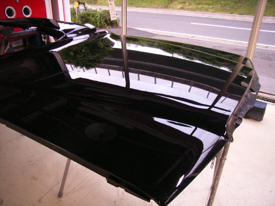 ご依頼内容としては、既存のボンネットの塗膜が粉を吹いたように劣化し、半分以上艶の無い状態(細かいクラック)で、それを修理する場合、旧塗膜を全て剥離し下地を作り直さなければならない状態でした。しかしそれは非常にコストの掛かる内容となります。なので、同色の部品を手に入れ、「それをそのまま付けてしまおう」との事となりました。 しかし当店では中古部品の手配はしておりません。これの理由として、お金を払って買った部品の塗膜に当初想像しなかった問題が発生していた場合、それは単なる産業廃棄物になる危険性がある為です。写真を見るだけや、先方(売り手ですね)の話だけで判断は出来ません。 しかしお客様がご自分で部品を探し、手配するのは問題御座いません(場合によっては受け付け出来ない場合もありますが)。発送先は当店宛てでOKです(勿論事前に打ち合わせは必要です)。 今回は幸いにも塗膜自体に「剥がれる」等の問題はありませんでした。全体的なポリッシュもご依頼頂いたので現在は綺麗な状態になっておりますが、中古部品の為やはり傷は数箇所付いております。しかしこちらは事前に「保管傷アリ」との事でしたので、オーナー様も問題にはしておりません。私的にも比較的「当り」な部品だと思います。