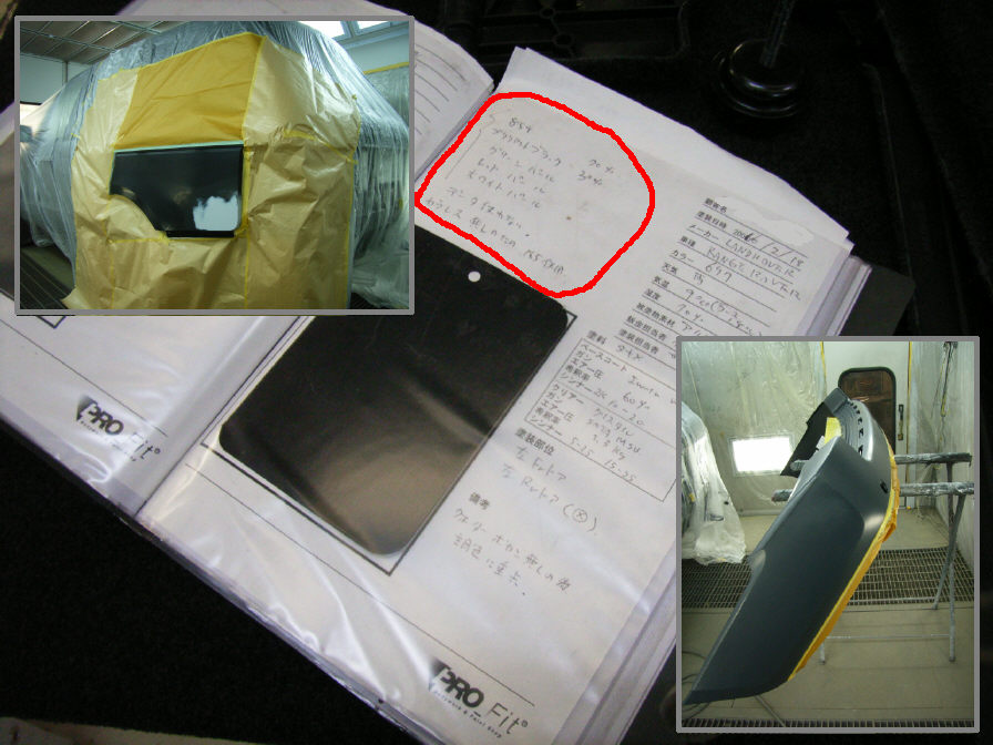 このレンジローバーの塗色は今まで結構経験があり(業者様からの依頼が殆どなので日記には掲載していませんが)、以前の掲載でも説明しましたが、塗料メーカーに記載のカラーデータは実車とはちょっと違います。データ上ではブラックの原色に少量のホワイトパールのみとなっていたりしますが、実際にはレッドパールやグリーンパールも混入されています。塗膜顕微鏡・肉眼どちらでも確認出来る程です。なので今回は前回の依頼時に作成した独自のカラーデータ(塗装カルテ)を参考にして調色をします。作業時間が短縮出来るのは勿論なのですが、何よりこのような事(色味・調色作業等)でオーナー様の不安が少しでも解消されれば、と思っております。