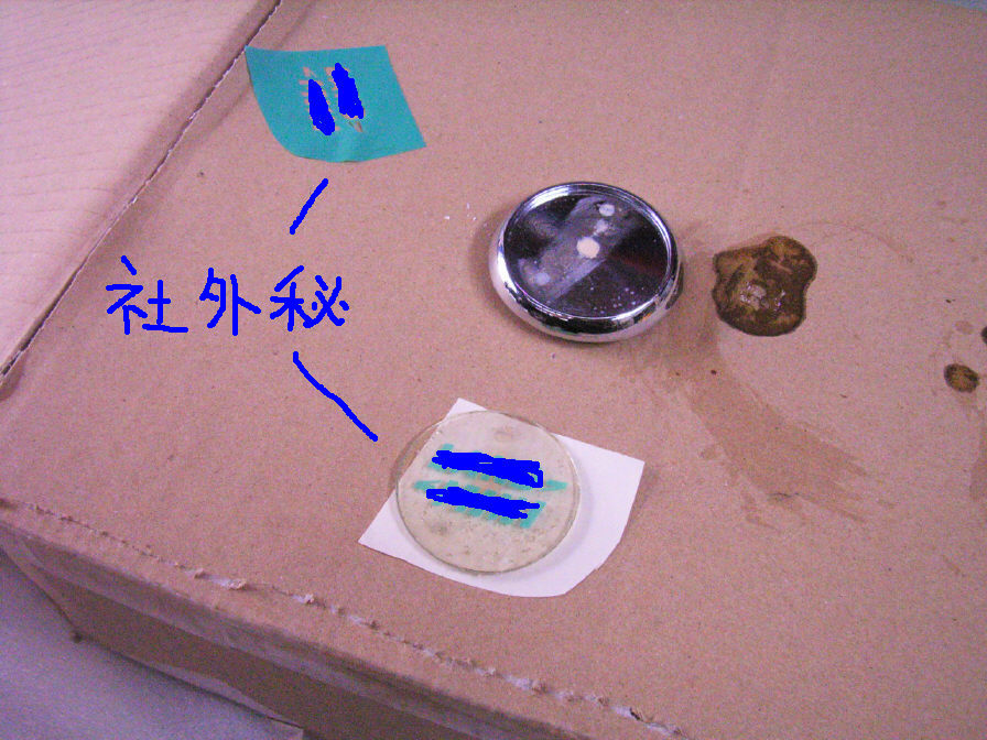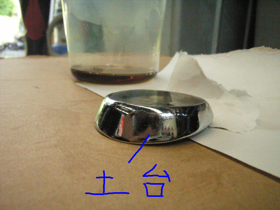方法としては、土台凹部に離型剤(スプレーシリコン)を塗り、その窪みにポリエステル樹脂(FRP補修で使う物。商品名:リゴラック)を流し込みます。これだけです。 ポリエステル樹脂が硬化したら、土台から外します。が、一回目は外すのが早過ぎた為に割れました…。薄い為、きちんと硬化していないと簡単に割れてしまいます。しかし完全に硬化させてしまうと、今度は外すのが大変になってしまいます。土台がシリコン樹脂のように柔らかければ(変形すれば)いいのですが、金属なのでそれが出来ません。 再度同じ事をして、今度は慎重にタイミングを見計らって取り外します。