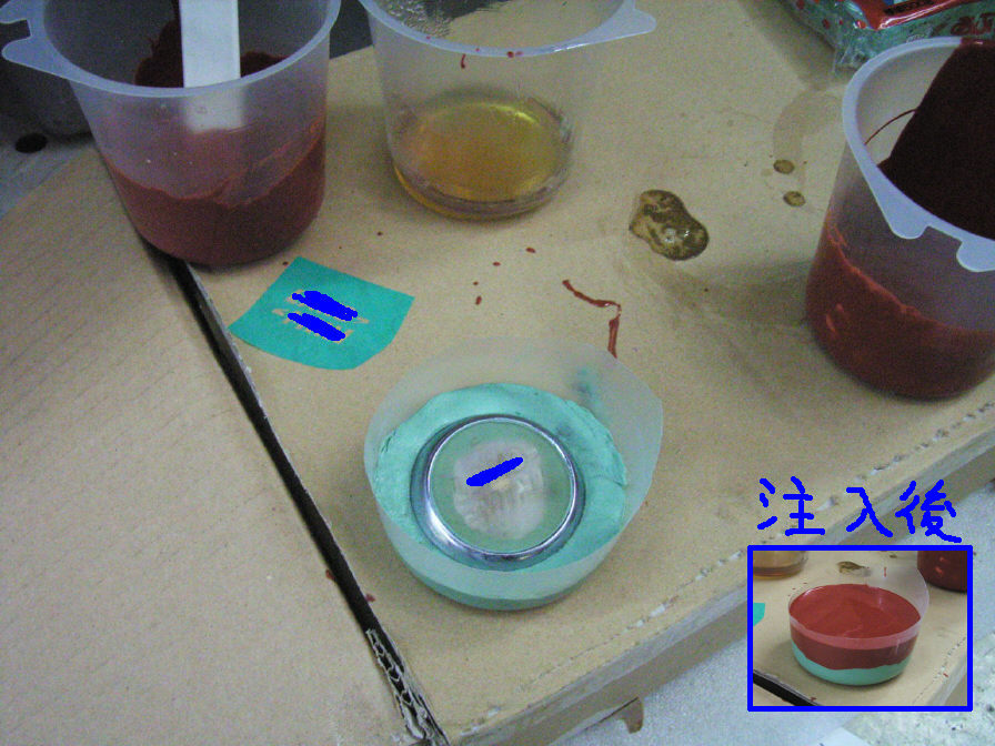 型から取り外して、そのままの状態で上下をひっくり返し、再度カップに入れます。今度はバッジ土台の裏側の型を取ります。 そして後に鋳造する際に金属(はんだの様な物ですね)を流し込む為の「穴」を作っておく必要がある為、その個所も油粘土で作成しておきます(実際にはこの穴が小さ過ぎた為に後に失敗します…)。