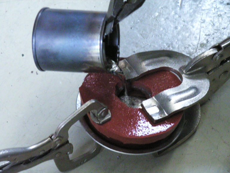 シリコン型は上下で分割するように作成しているので、これはバイスで固定します。この固定が甘いと、隙間から溶けた金属がこぼれてきます(これも今回経験済みです)。金属では無くエポキシレジン(樹脂)などの場合にはゴムなどでOKです。念のためお皿か何かを下に敷いておくと良いでしょう。