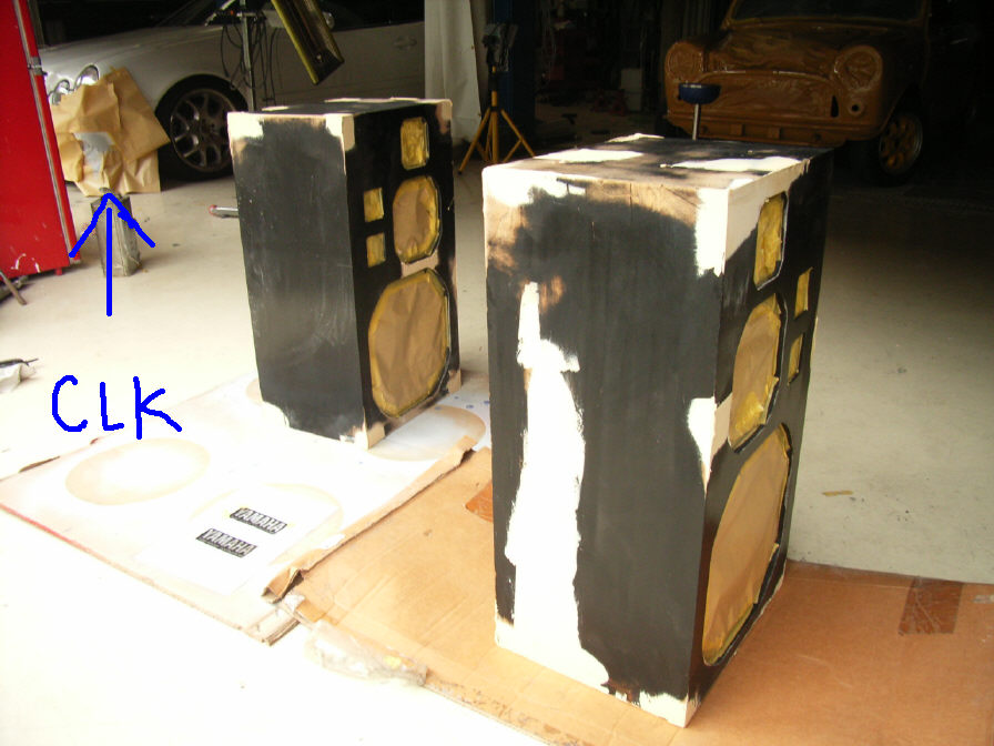 CLKは既に下地が完了し、明日本塗り予定となります。今回CLKとご一緒に依頼されたものとして、「スピーカーボックス」があります。一本(一個)10万円以上する名機との事です。 木(「モク」と呼びます)の塗装としては、職業訓練学校在勤時にも多少勉強させて頂き、当時は「研の粉で目止め」なども習ったのですが、今回は特にその工法に拘らず、割れた部分などの補修は通常のパテ(ポリエステルパテ)を使用します。既に何回かウッドパネル(自動車内装に使われるローズウッドなど)の補修にも使用しているので、(と言うより、上にウレタン系塗装をするのでこちらの方が適しているとも思えます)問題は無いと思います。 既存の状態では、多少木目の残った「半艶の黒」なのですが、ご依頼内容としては「ピアノのような艶々の黒に」となります。しかしこれは結構大変な事です…。木の塗装は「目止め」が必要な理由として、表面に多くの「気孔」があり、これを「埋める」或いは「抑える」為の下地が大変なのです。若い頃に十分痛い思いしました…。