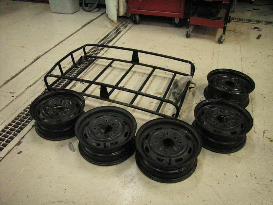 今車体に履いている(装着している)ホイールは仮のもので、今回のコンセプト上、このテッチンホイール(鉄製ホイールの事です)が必要なのです。ルーフキャリアもです。先日ミニ屋さんが持って来てくれました。いつもお手数お掛けして申しわけ御座いません。