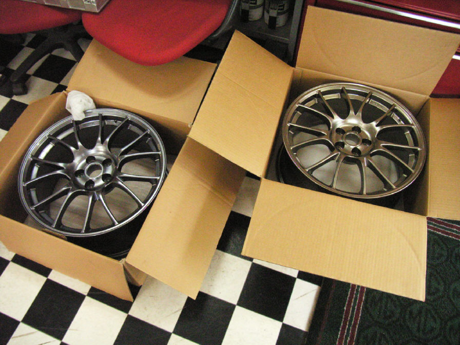 ホイールをお預かりした時の画像です。右のゴールドっぽいアルミを、左のガンメタっぽい色に変更しました。どちらも新品です。