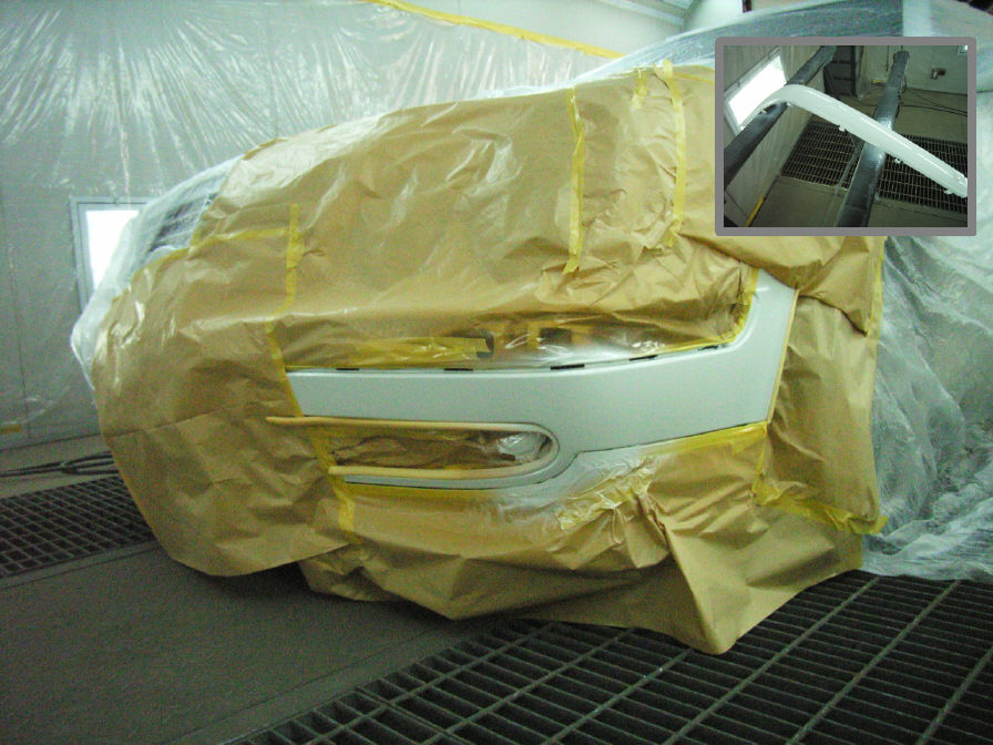 既に何回かお世話させて頂きますCLKで、今回はフロントバンパー左部の補修となります。バンパーの部分は部分的な補修クイックスポットで行い、モール(レール)部分は取り外して塗ります。