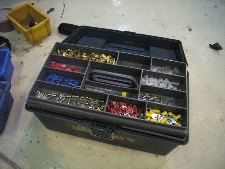 最近の車両の電装結線は「専用カプラー」がメインとなっているのですが、基本構造が昔から変わらないミニのような車両だと、未だに「ギボシ端子」などを多用したりします。それに限らず、後付けの社外品パーツなどが装着された車両も多いので、伝送系の小物は常備しておく事は自動車関係の現場では普通の事です。しかも「会社的」と言うより「個人的」に揃えている人は多いです。
