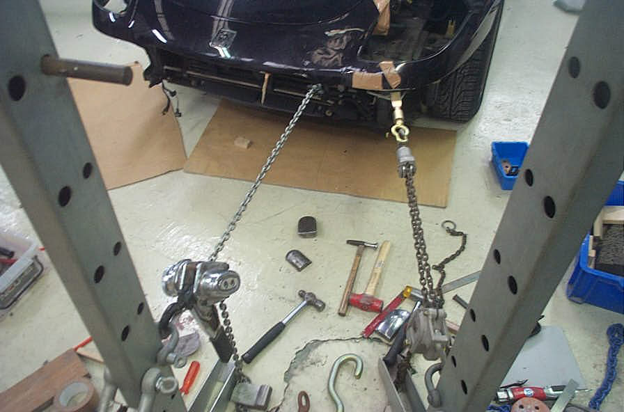 今回の事故以前に、フロントカウルは修正が入っていたようで、付いていたパテ(1ミリ以上付いてました…)を剥がすとバンパーとのチリが合いません。なのでそちらの方向にも引っ張ってあげます。事故によって入力された力を、逆の方向に同じだけ引っ張ってあげれば理論上は元に戻る筈なのですが、鉄板が伸びて変形しているのでそうもいきません。引っ張ってあげながら、盛り上がって高くなった箇所をハンマリング(ドリーとハンマーを使って叩く事です)します。チェーンを掛けてテンションを掛けながらであれば作業者(自分)の体はフリーになるので落ち着いて丁寧に作業が出来ます。