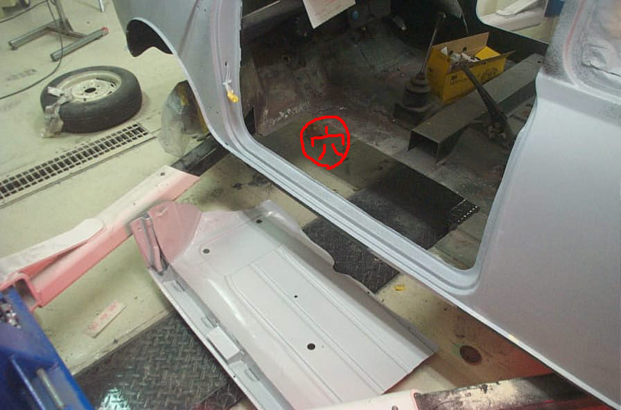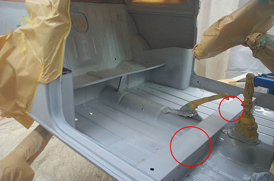 ちょっと前の工程に戻りますが、先ほど説明した「半自動溶接」と「繋ぎ目のパテ」の部分がこの画像の赤丸の部分になります。床を貼り直す際に、この車体室内の横に通ったパネルも一旦切り取っているので繋ぎ直しました。犠牲車両から同じ部位を切り取った物を、少し小さめになるように折り曲げ直し(叩き直し)、車体に残っているパネルの内側にはめ込み、ここはスポット溶接をして「フランジ」状にします(隙間にはウォッシュプライマーを流し込みます)。そして切り取ったパネルをこのフランジ状になった箇所に被せるのですが、ここは恐らく車体の要になる部分だと思いますので(フレームとはちょっと違うと思うのですが…)、この箇所のみ半自動溶接を施し(反対側の端サイドシェルとの接合部も半自動溶接です)パテでラインを出しています。車体の「ネジレ」に重要な箇所なのでパネルボンドは控えました。 ちなみに白く塗られた物はエポキシ系浸透型プライマー「エスコ」です。