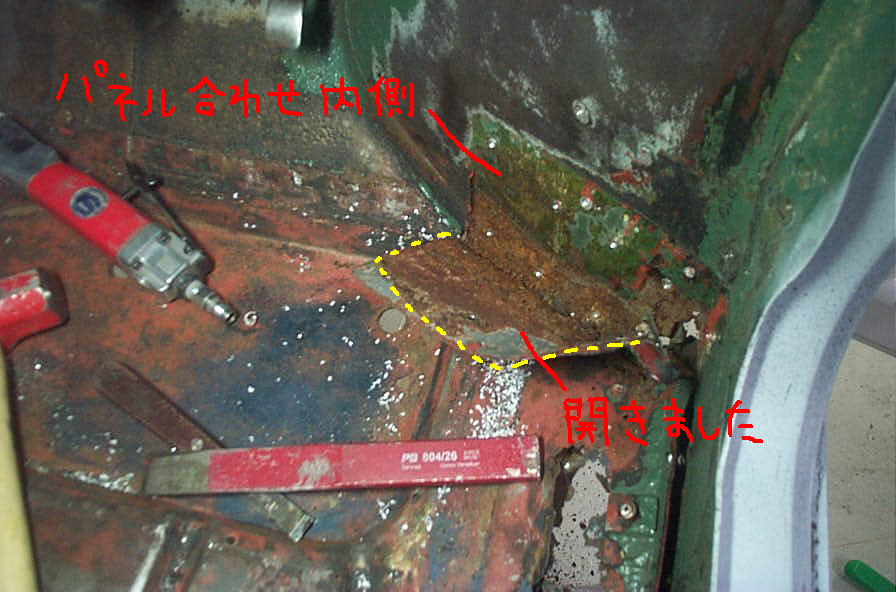 フロア(床)を大きく切り取る前の状態です。どこから切り取るか悩んでいた時に「とりあえずは開いてみよう」と思って張り合わせてあるパネルを切り開いた状態です。アルミリベットのみで取り付け、貼り付けパネルの淵はアスファルトの様なシーラーで蓋がしてあるだけの処理で、内側は旧塗膜までもが残っている状態なので錆も残っていたと思われます。日々足元で錆が進行し続け、結果穴が開いてしまった模様です。