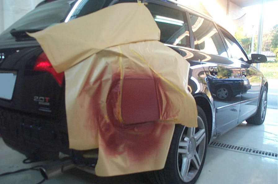 お待たせしております。アウディは板金が20%完了した状態です。状況的には「レッドブラウン」が塗布された状態ですが、まだハンマリング作業は続きます。