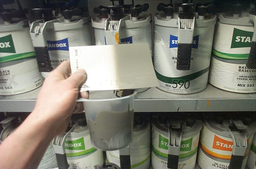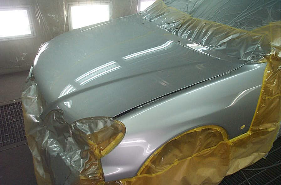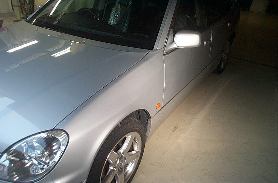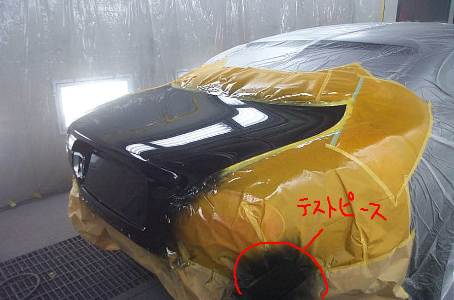 なので、オーナー様の許可を頂き左のフロントフェンダーをボカシとして塗らせて頂く事になりました。色的には右側面(正確には右フロントフェンダーのトップ部)に合わせて調色し、ボンネットはベースコート一枚、左のフロントフェンダーはトップ部のみベースコートをボカし、パネル一枚クリアーを塗ります。ベースコートはプレスラインでボカすのである程度色が違っても解らない仕上がりに出来ると思います(左右でフェンダーが全然色が違うのです・・・)。 セオリーであれば左の新車時の塗色に合わせて色を作らなければいけないのですが、前記した通り、理由が理由なのでこの処置が正しいと考えます。