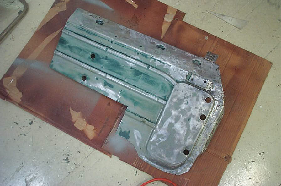 先ほどのフロアパネルを研磨し終わった状態です。貼り付けてからフロアー全体を纏めてエポキシ系プライマーで塗布するのですが、このままの状態では直ぐに酸化(錆の発生)してしまうので、この時点では軽くウォッシュプライマーを塗布しておきます。たった一日開いただけだとしても、この作業を行うのと行わないのでは今後相当差が出てくると思います。それくらい「錆」の発生は早いのです…。