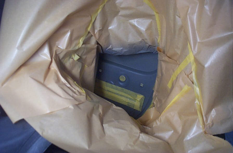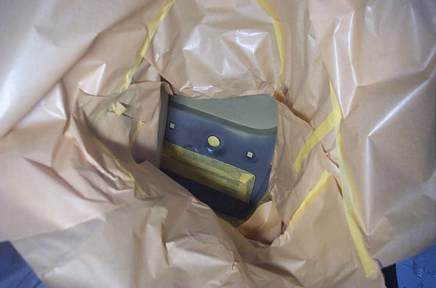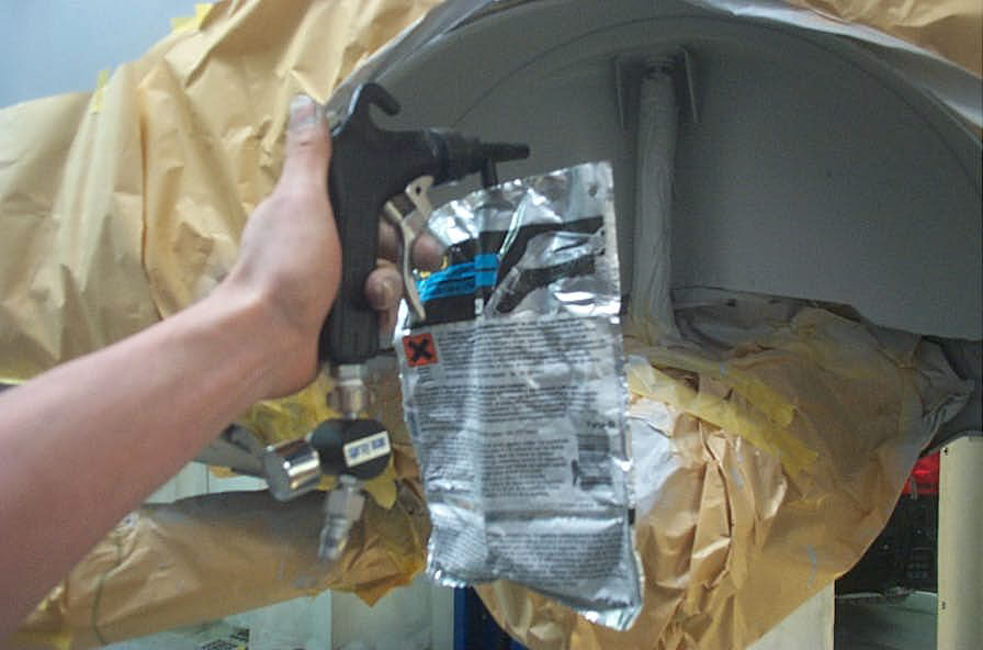 今回このミニの旧塗膜を剥離する際に困難を極めた「アスファルトのようなボディーシューツ」が非常に嫌だったので、今回の修理では2液ウレタン製のボディーシューツ(3M社製)を使います。これは主剤と硬化剤がパッケージの中で混合出来るよう構造になっていて、専用ガンを使って吹き付けます。ノズルはパッケージに最初からセットされているので、作業前も後も手が汚れずに出来ます。しかし「肌」が思うように出来ないのと、コストが高過ぎるので余り使っていません。今回の修理には理想的だと思います。何より今後剥離する必要がある時、ペーパーに絡みつくような事がありません。