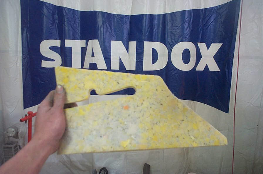 そして裏が硬化したら表のガムテープを剥がし、その部分を研磨足付けして、穴の大きさより若干大きめにファイバーマットを再度貼り付けます。合計3枚になります。