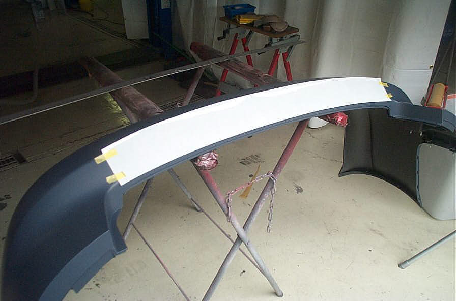 既に鈑金塗装作業は完了し、追加部品の到着待ちになるアウディですが、今回ご依頼された作業として「リヤバンパー上部の保護シール」の作成の紹介になります。器用な方ならDIYも十分可能だと思いますので是非お勧め致します(アウディではこの箇所に付ける保護プレート等のオプションが無くお困りだったとの事です)。