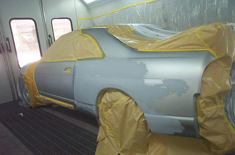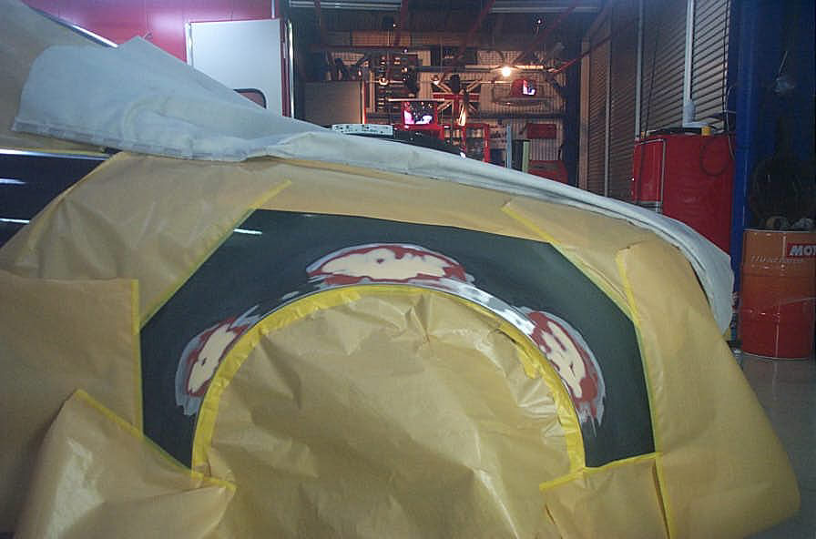 いつも通り、板金(叩き)完了後にスタンドックスレッドブラウン(プライマー)塗布、スタンドックスポリパテ塗布&研磨、フェザーエッジを綺麗に出してマスキング完了、この後ウォッシュプライマー(デュポン820R)を塗布し、そしてプライマーサフェーサーで大きく覆います。「重防錆処理」の完了です(一般的な防錆処理としては、最後の「プライマーサフェーサー」のみの場合が多いのでこの様に呼んでいます。厳密にはちゃんとした定義があります。以前の日記内に説明があります)。