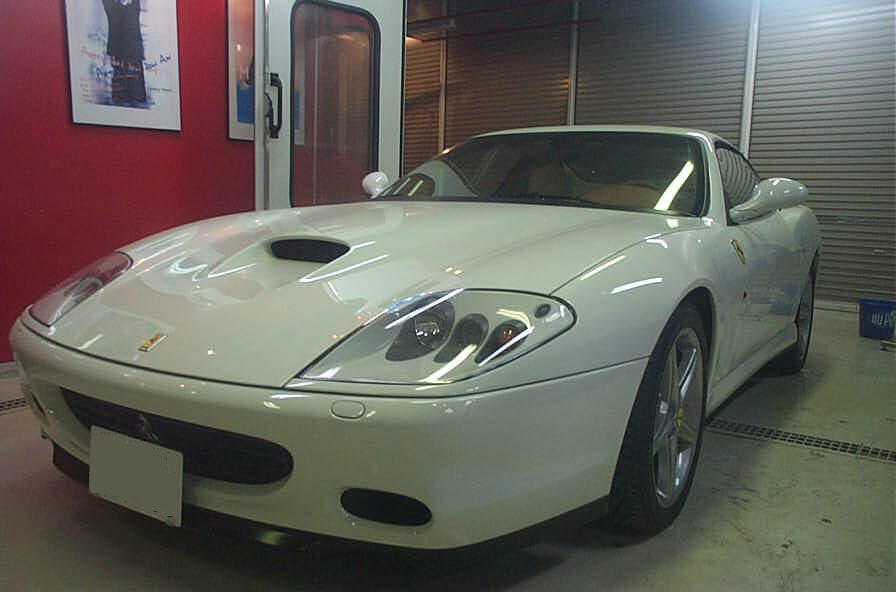 塗色はBIANCO、カラーコードは100になる珍しいホワイトソリッドカラーです(部品屋さん曰く内装も相当珍しいそうです)。 当初はフェンダー交換も考慮していましたが、板金での修正になったのでオーナー様の気にされていた「パネル間の色違い」も解消出来たと思います。フェンダー内でベースコートのボカシを行い、クリアーのみパネル一枚での「2コート塗装」が可能となりました。画像を見ると解ると思いますが、ドア寄りの方に色は飛んで(塗装して)おりません。 今までのフェラーリであれば1コートソリッドが基本だったのですが(ROSSOのみを知るだけですが…)、こちらは新車塗膜が2コートでの構成になっております。 ちなみに既にパネル間での色違いは存在していたので、「極力ドアに色を近づけてフェンダー一枚全てに色を入れて(ベースコートを塗布して)もっと良くしよう」と考えていたのですが、調色をしていて気付きました。ドアの上部と下部で色が違うようです…。ドアの下部の方が「スカシ」が暗い感じです。これの理由としては、恐らく染まりきっていない(隠蔽しきっていない)事だと思います。ベースコート下のプライマー色が濃いグレーな為です。これは結構最近では良くある事なので安心して頂いて問題御座いません。低隠蔽色の殆どの車両がこれにあたります。有名なところではVWのNewビートルなどはかなり酷いです…。 近年の傾向として「環境問題」があるので、「車一台に使う塗料量」を少なくしなければならないのです。またレース車両などでは車体重量を抑える為に昔から「塗料は1キロ以内で」なる指定があったりは良く聞きます(「1キロ」は勝手な想像です)