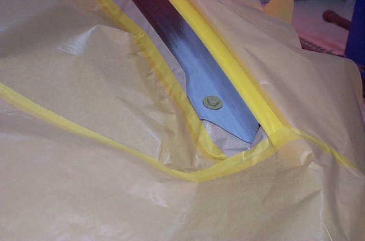 またこの場合、塗る方向も一定にしなければなりません。この折り目に直角にスプレーしてしまうとテープ際にクリアーが溜まってテープがくっついてしまいます。なのでスプレーガンがこの箇所に差し掛かる時は30度くらいの角度を付けて折り目の奥に塗料が入らないようにしてあげます。実際にはこの角度を少しずつ変えて行き、最終的にはベースコートより大きめにクリアーがコートされる様に仕上げます。塗り方自体は難しい事では無いのですが、スプレーする際に角度が付くのでその方向の肌が悪くならないように気を使ってあげるのがちょっと難しいところです。 さらに場合によっては「半ドア」状態にしてあげたり、このマキシテープの奥行きを変える事によってもボカシ際が変化したりします。