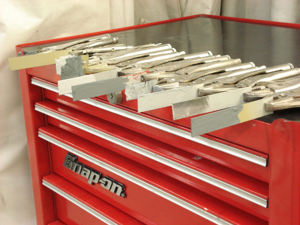 主画像が叩き終了の状態で、この後レッドブラウン(パテ前に塗布するプライマー。スタンドックス製品)を塗布し、強制乾燥の後に軽く足付け(#400研磨)をしてパテ塗布してラインを成形します。 そして研磨の画像内右下の枠内がプライマー(&サフェーサー)塗布前の状態です。白いチューブ状に見える物は、断面が丸状になったスポンジ製の帯に粘着材が付着した物で(3M社ソフトテープ)、今回はサフェーサーの塗装際を滑らかにしたいので使用しています(今回に限る事ではありませんが…)。 同時に、板金した箇所の裏側にプライマーを塗布し板金工程の完了となります。