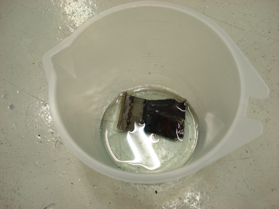 こちらが「錆」が発生したテストピース(鉄)です。もう自然に帰りたがっている(還りたがっている)状態ではありますが、リン酸でどこまで錆を除去してくれるのか、リン酸皮膜はどこまでの耐久性(持続性)があるのかを実際に知りたいと思いテストしてみます。浸している溶液はデュポンメタルコンディショナー(リン酸)です。ちなみに撮影している時に発生した水素と思われる気体で少し気分が悪くなりました…。とても効いている感じがします(明日には金属が溶けきっている可能性もあるのですが…鉄だから大丈夫だとは思いますが…)。こちらも結果解り次第報告したいと思います。