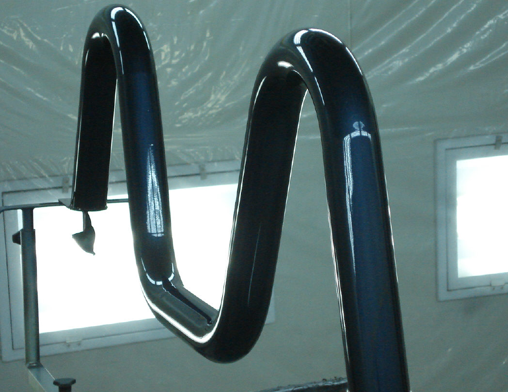 「素地の影響を受ける」については、例えば「巣穴」があればそのまま仕上がりまで影響してしまいますし、細かい凸凹もそのままで仕上がります。微小なラインの補正も全く出来ません。しかし今回の場合は丸パイプの形状である為、またパテなども塗布していない為にこのデメリットは少なくなります(勿論ご要望にもよりますが)。