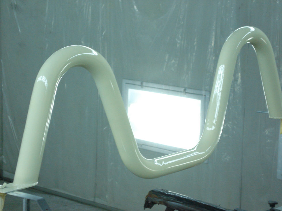 先ほど掲載したロードスターのロールバーの下地塗料を塗っている状態です。 今回の御依頼では極力コストを下げる為、「ウェットオンウェット」での塗装としております。