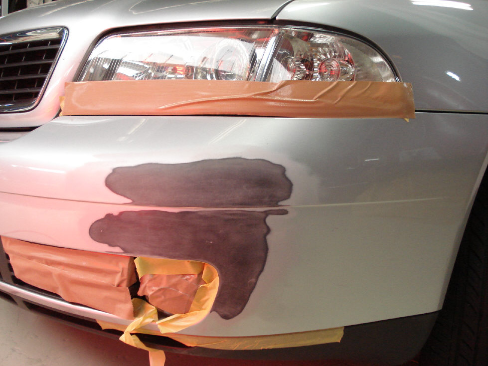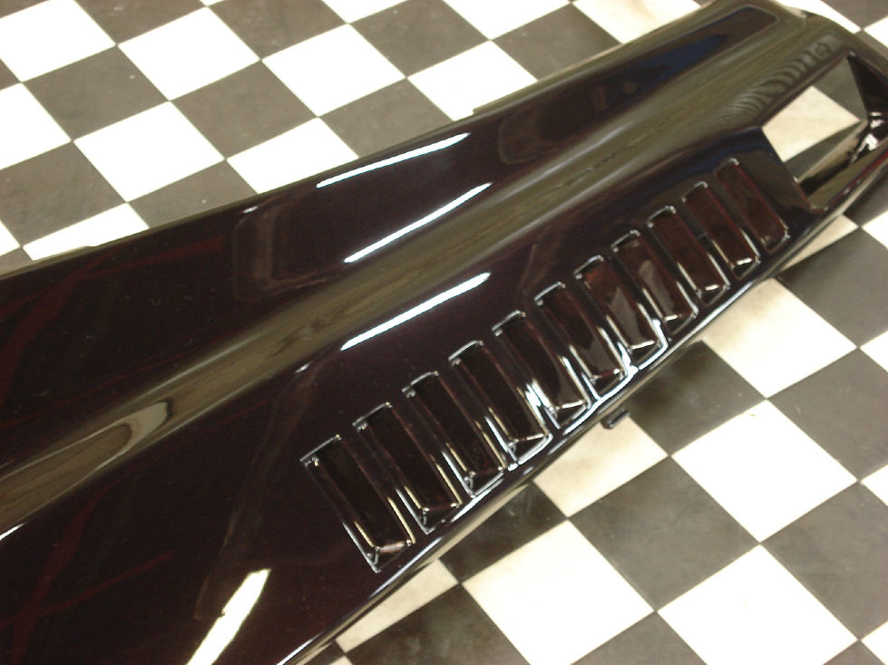入庫時の状態は、多少深いエグレを伴った10平方センチくらいの範囲での擦り傷でした。画像の状態は傷を全て削り落とし、バンパーの樹脂自体も掘り下げています。削った分、凹んだ状態となっております。 この後、バンパーなど比較的柔らかい素材に適用したエポキシパテを塗布し(塗布と言ってもヘラ付けです)、ラインを形成します。そしてプラスチック用プライマー→サフェーサープライマーを塗布し、硬化後にさらに微妙なラインを形成する為水研ぎを行います(#320→#600→#800→#1200)。