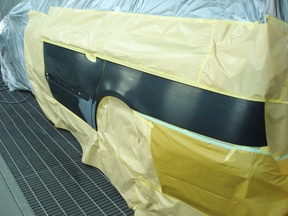 大変お待たせしております。ボディの本塗りは先週既に完了しておりまして、本日はピラー部の半艶黒の塗装を完了致しました。完成までもう少しです。