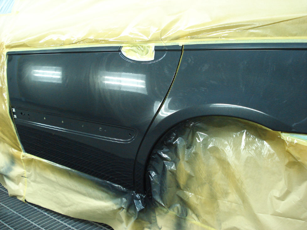 今回損傷を受けたのは「左リヤドア」と「左クォーターパネル」(リヤフェンダー)なのですが、通常通りに作業を行うと相当コストが掛かってしまう修理となりますので、今回は「プレスラインボぼかし」での対応とさせて頂きました。通常は傷が小さくても「パネル一枚」での塗装が通常作業としていますが、今回のようにパネル内にプレスラインが走っている(存在している)ケースでは、デメリットを少なく(仕上がりを極力落とさずに)コストを下げる事が可能です。特に部品脱着費と部品費用を削減出来ます。