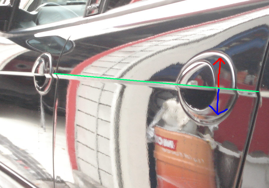 先日も記載しましたが、今回のシトロエンは「プレスライン」を見切りとして塗装しています。 画像内のグリーンの部分が「プレスライン」で、この上が新車塗膜の肌で、下が今回塗装した部位です。