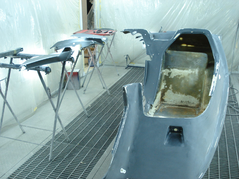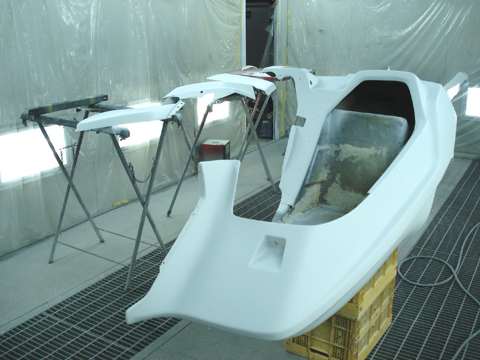 ボディ側ABS樹脂の部品の穴は溶着で埋め、FRPのサイドカーにあった穴は新たにファイバーを貼り付けて埋めてあります。その他ひび割れ箇所もファイバーで補修してあります。 特に全体的に小傷・飛び石傷が多く、旧塗膜をある程度削り落とし、パーツ全てにサフェーサーを塗布して下地から作り直します。 サイドカーの内側には後ほどボディーシューツを全体的にぬるので、現段階ではまだ下地処理もしていません。後日ダブルアクションで全体的に削り落とします。