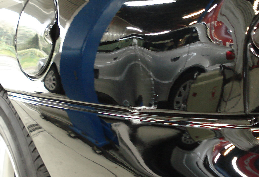 入庫時は写りこみの無かった塗膜も、現在は写真の通りです(仕事なので当たり前なのですが…)。しかし大切な事は、この艶がいつまで続くか…になります(出庫時が美しいのは当たり前の事です)。 私的にはこの「塗膜」がいつまでも変わらない状態を維持出来るように、別項で説明したような下地塗料のテストを行ったりもします(と言っても今回は問題の起きている塗膜は除去してあるので、テストした内容とは余り関係ありませんが…)。