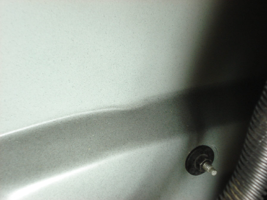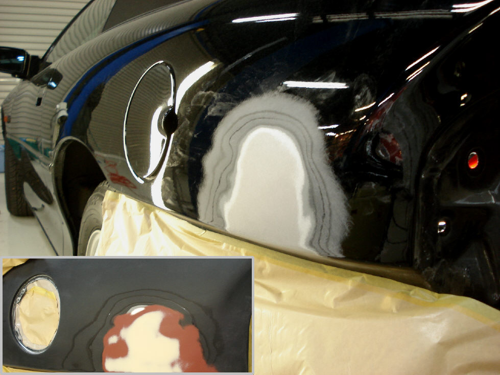 左クォーターは以前修復暦があるらしく、さらに給油口付近の処理が悪かったらしく旧塗膜が剥がれ掛かっていたのでこちらは除去します。原因としては給油口内のカバーを外さずに処理した為と思われます。 その他エクボも数箇所あったので一緒に処理しておきます(どれも勝手に判断している訳では無く、ご依頼されている内容です)。