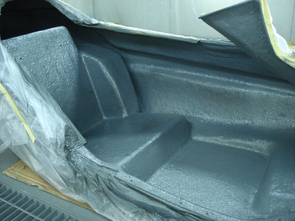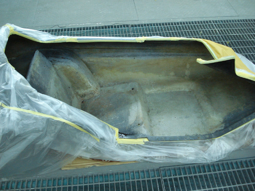 ご覧の通り、内側は結構ひどい状態です。 元々内装が糊でついていたらしく、全体的に取れそうでとれない接着剤が残っています。 本来であればこれらの不純物は根こそぎ取り除かなければならないのですが、FRP繊維の凸凹部に入り込んでいる為、相当深くまで削り落とさなければ除去し切れません。アセトン(強い溶剤)で溶かしてしまえば一発なのですが、これであればポリエステル樹脂である本体(FRP)も解けてしまいます…。