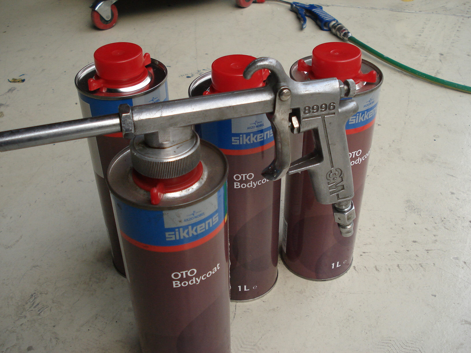 ボディシューツではこの他に、一液溶剤系の物や二液ウレタン系の物もあります(以前日記にも登場しています)。性能的・作業性は郡を抜いて2液ウレタン系のボディシューツが良いのですが、とにかくコストが大きくなります。 今回使用したのは3本(3kg)で、これでも結構な材料費ではありますが(普通こんなに使いません…)、2液ウレタン(3M社製)だとすると10倍くらいになるかも知れませんので…(勿論事前にオーナー様と相談済みです)。