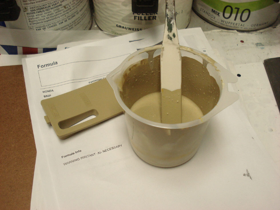 フュージョン本体(バイクの方でサイドカーではありません)に付く内装部品に合わせて色を作ります。と言ってもある程度の簡単な目調色です(およそ10分)。