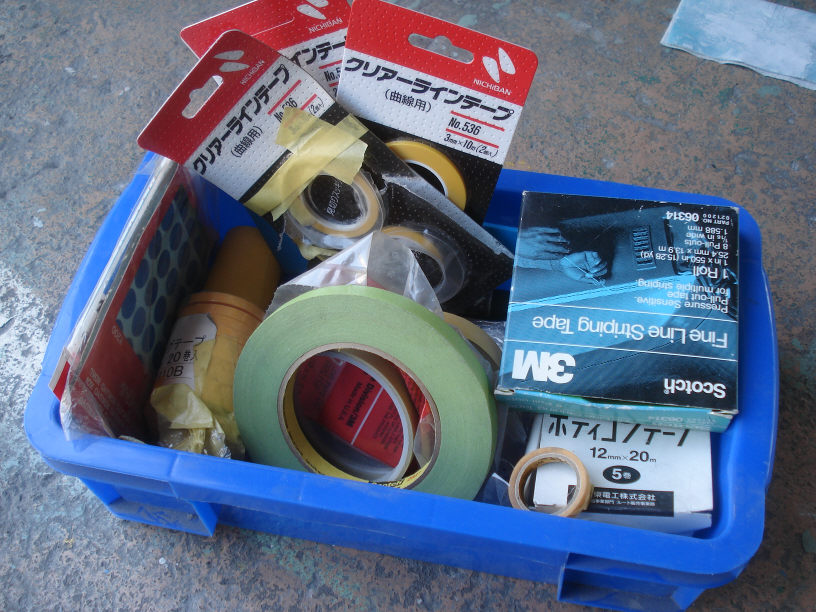 塗装で使う一般的なテープは、和紙状のマスキングテープなのですが、塗り分けや曲線部分のマスキングには普通のテープでは無く、それ専用のテープを使うのが一般的です。