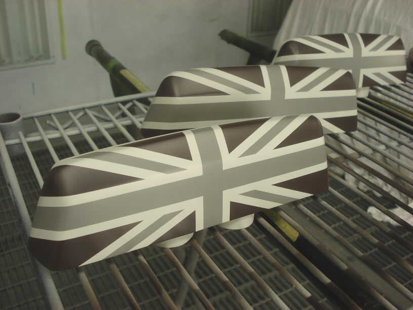 以前からプロフィットのサイトをご覧の方は既にご存知だと思います。これにミニの生まれ故郷である英国のトレードマーク(みたいな)ユニオンジャック(英国旗)を塗装で行います。 と言っても、ユニオンジャックは「赤」と「青」と「白」の3色で構成され、少しドギツイ所もあります。 なのでこの色相を無彩色化したモノトーン調の色に変更してしまいます(してしまいました)。