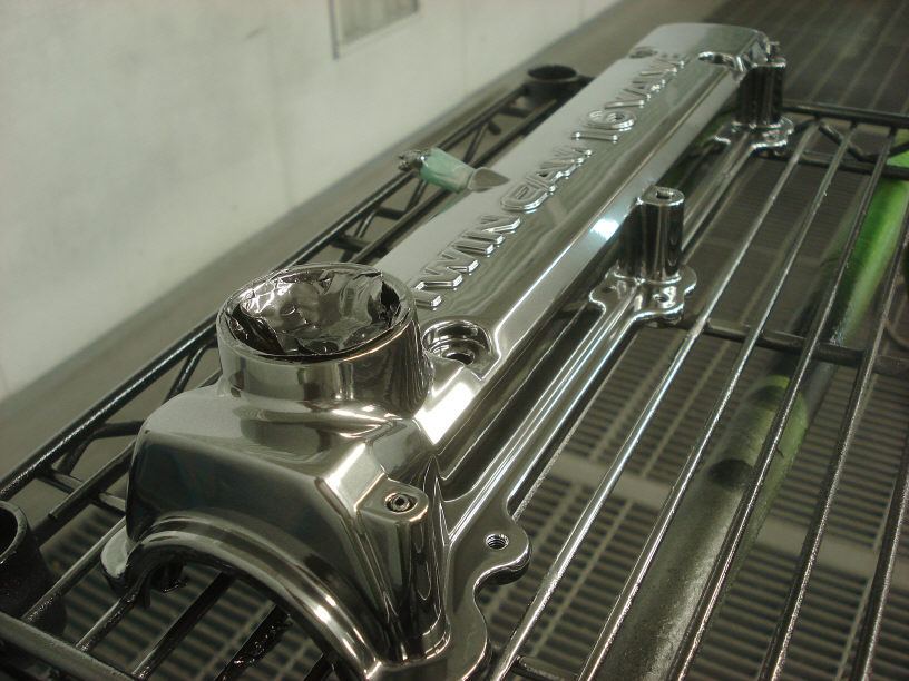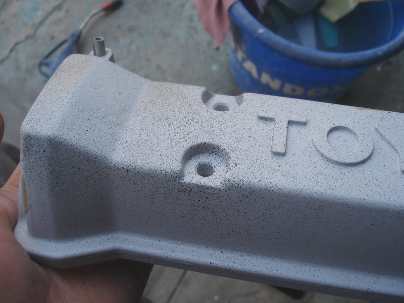 そしてプライマーに続けてサフェーサーの塗布です。 通常ヘッドカバーに行う「結晶塗装」では、鋳造素材の荒さを隠してくれる性質がありますが、ハイパーブラック(メッキ調)塗装だと下地が命ですので、特に今回のような磨きがし難い形状をしたパーツの場合、塗りっぱなしの「ノンポリ」(=ノンポリッシュ=磨かない仕上げ)が必須条件になります。 と言っても日常そんなに変な肌で仕上げたりはしませんのでそんなに力む必要は無いのですが、とにかくここの下地は重要です。