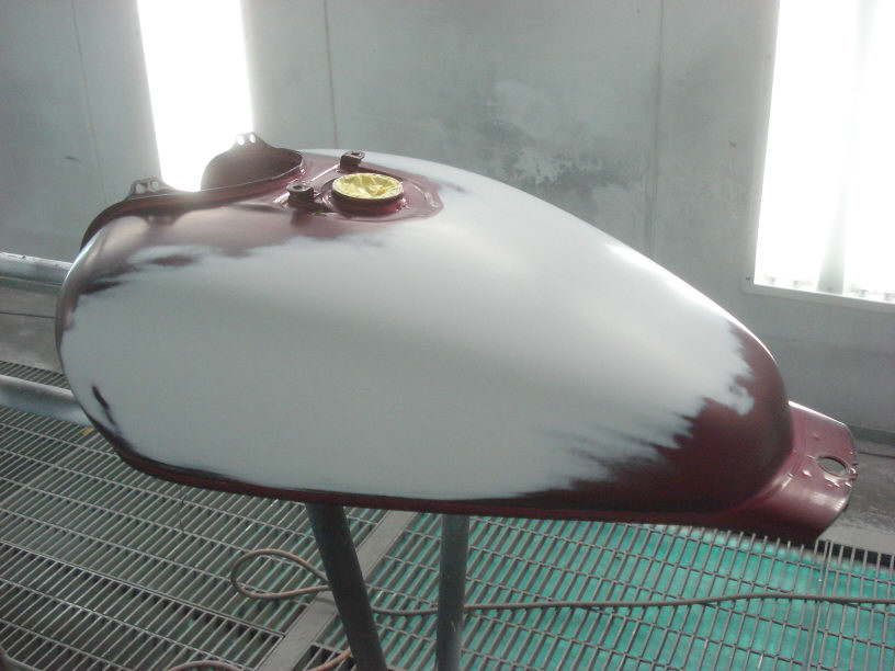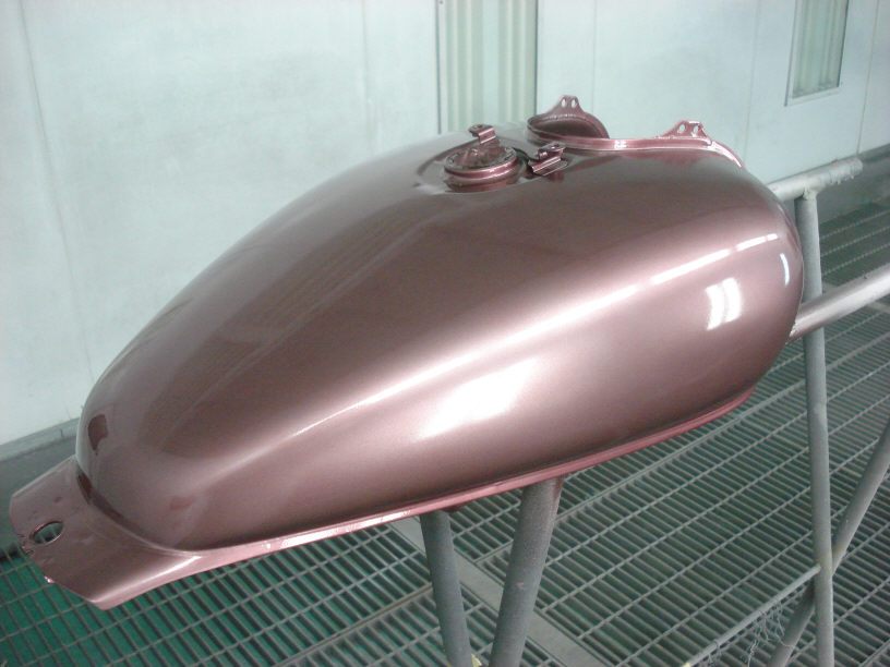 画像だと深みが解りにくいのですが一応キャンディーのそれらしく深みが出せたと思います。ブースで焼きあがって仕上がったタンクを工場内に置いておいたら、遊びに来た業者さんがこれを見て感激してくれました(ちょっと自慢っぽいですが一応本当の事ですのでお許し下さい…)。 その業者さんもバイクを扱っているとの事で、今も他の塗装屋さんにお願いしているらしいのですが、どうやら今回の仕上がりを見て頂けて今後から仕事が頂けそうです。感謝感謝です(まだ早いですが…)。