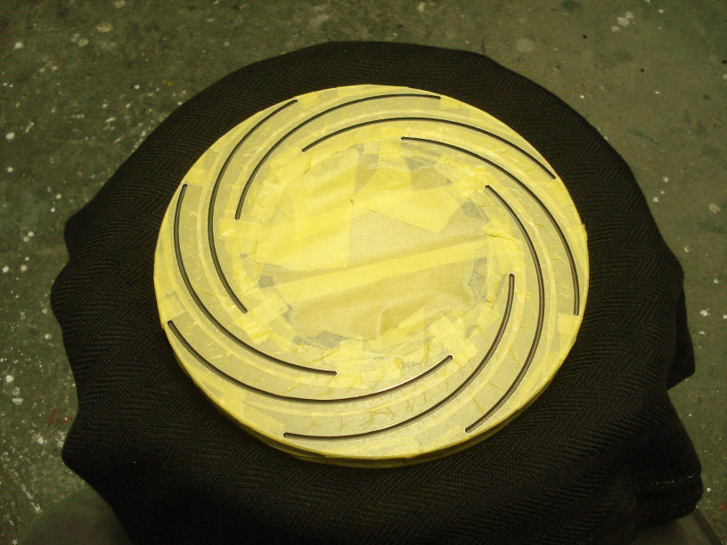 画像は見てのとおり、ローターのスリット部をサンドブラスト処理する直前の状態です。裏側もマスキングしてあります。マスキングは一見すると面倒そうに見えますが、実際にはそんなに面倒ではありません。マスキングしている時はとなりでゴトー氏が「目が回りそうだね」なんて言っていましたが、そんな事はある筈もありません(笑)。