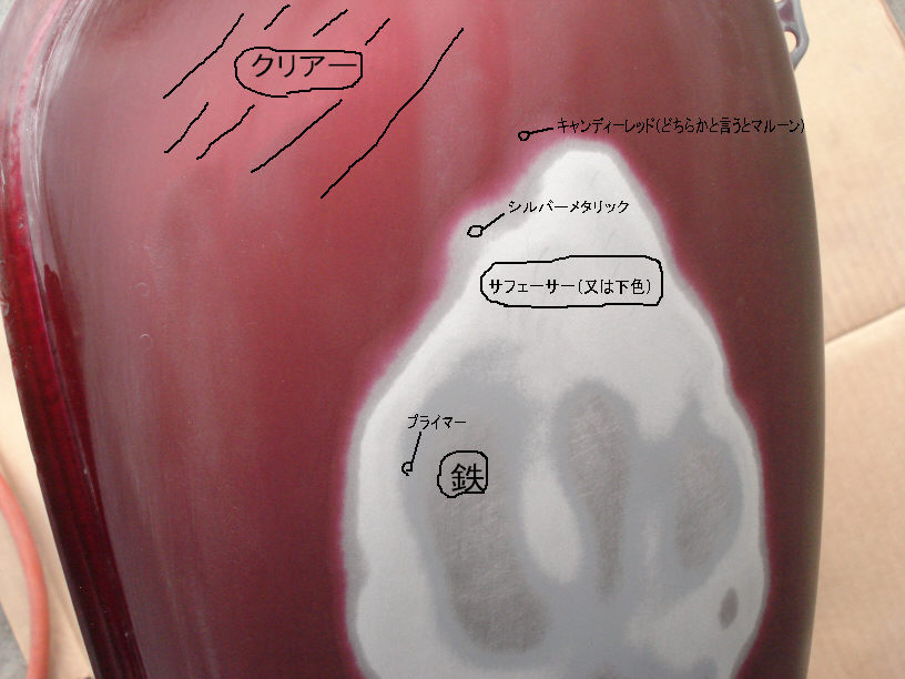 一般的にはベースコートに「シルバー」を塗装し、その上に「色の付いたクリアー」を塗ります。今回は赤系のキャンディーで、調色の結果「マゼンタ」系と「マルーン」系が入ったクリアーです。