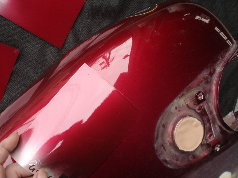 全く話がそれましたが、画像はマグナのタンクで、キャンディーレッドの調色時の色あわせですね。四角いシートは調色専用の紙です。表面に処理がしてあって塗料を吸い込まないようになっています(これが以外と結構高いです)。