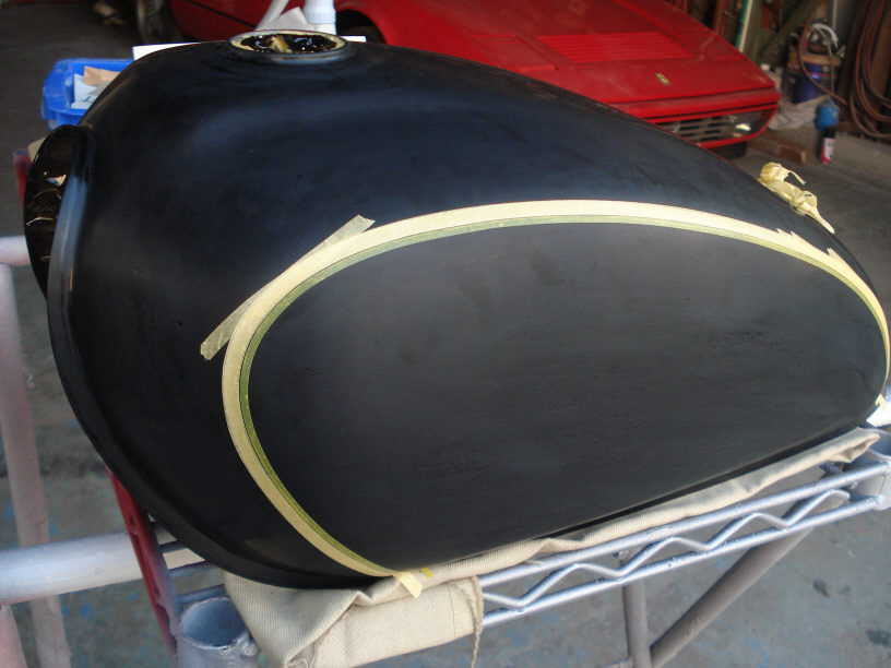 画像は一番最初の段階ですね。 タンクはクリアーまで綺麗に塗れていましたが、ライン入れるので再度全面を足付け処理しています。