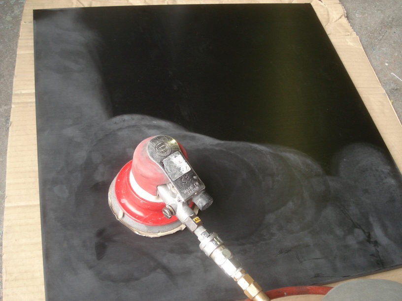 既存状態は黒のアルマイト仕上げですので、ダブルアクションサンダーに#240のペーパー貼って表面を削ります。所謂「足付け処理」ですね。