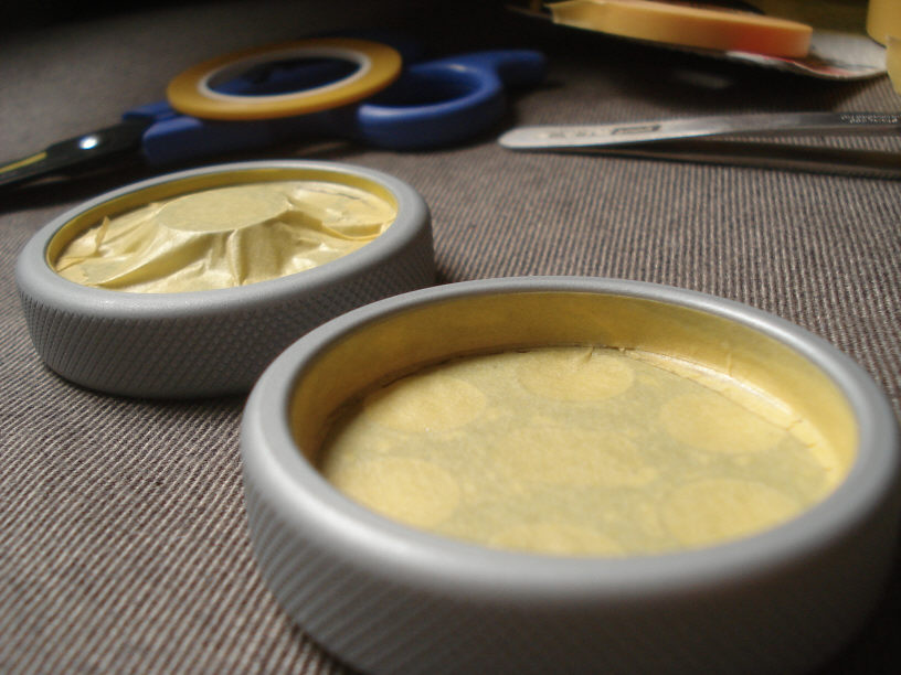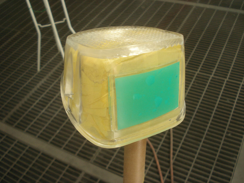自動車のテールランプとは違いレンズのみ外れるのでレンズの裏側をマスキングしています。なのでマスキングテープが透過して見えるので黄色く見えますが、レンズ自体はクリアーです。