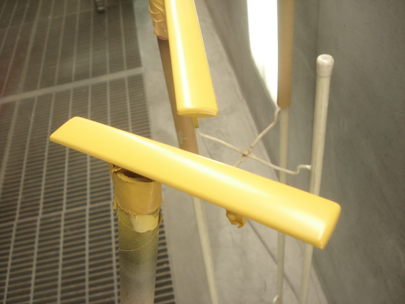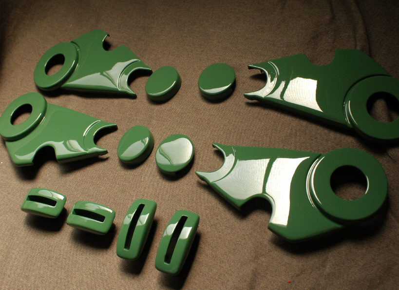 ただ単に塗るだけだとこうは成りません。下地処理としてザラザラを削り落とし、サフェーサー(下地塗料)で平滑な下地を作らないとボディ同様の艶々した塗膜にはなりませんので。そこが大変な所です(お金も、ですね…)。
