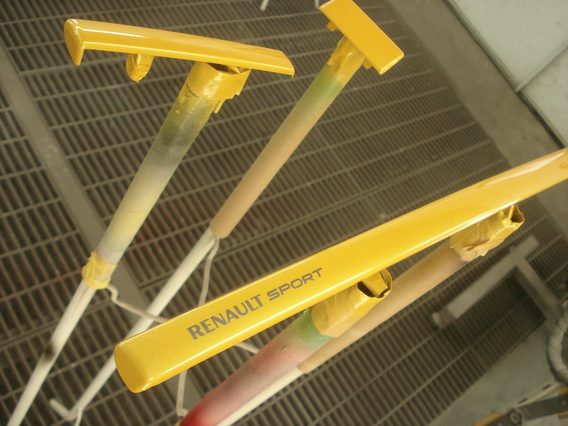 画像は本塗り前で、足付け処理されてますので艶が消えた状態になってます。 元々あった「RENAULT」のロゴも削り落としてます(クリアーの上にプリントなので結構簡単に削り落とせます…)。