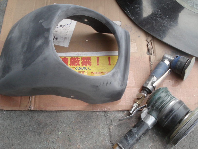 ヘッドライトの入り込んだ部分は通常のダブルアクションサンダーでは入りませんので(直径125cmでしたっけ…)、この場合にはミニサンダーを使います。 昔から重宝している物で、シングルアクション、ダブルアクション共にワンタッチで変えられます。3万円くらいだったと思います。